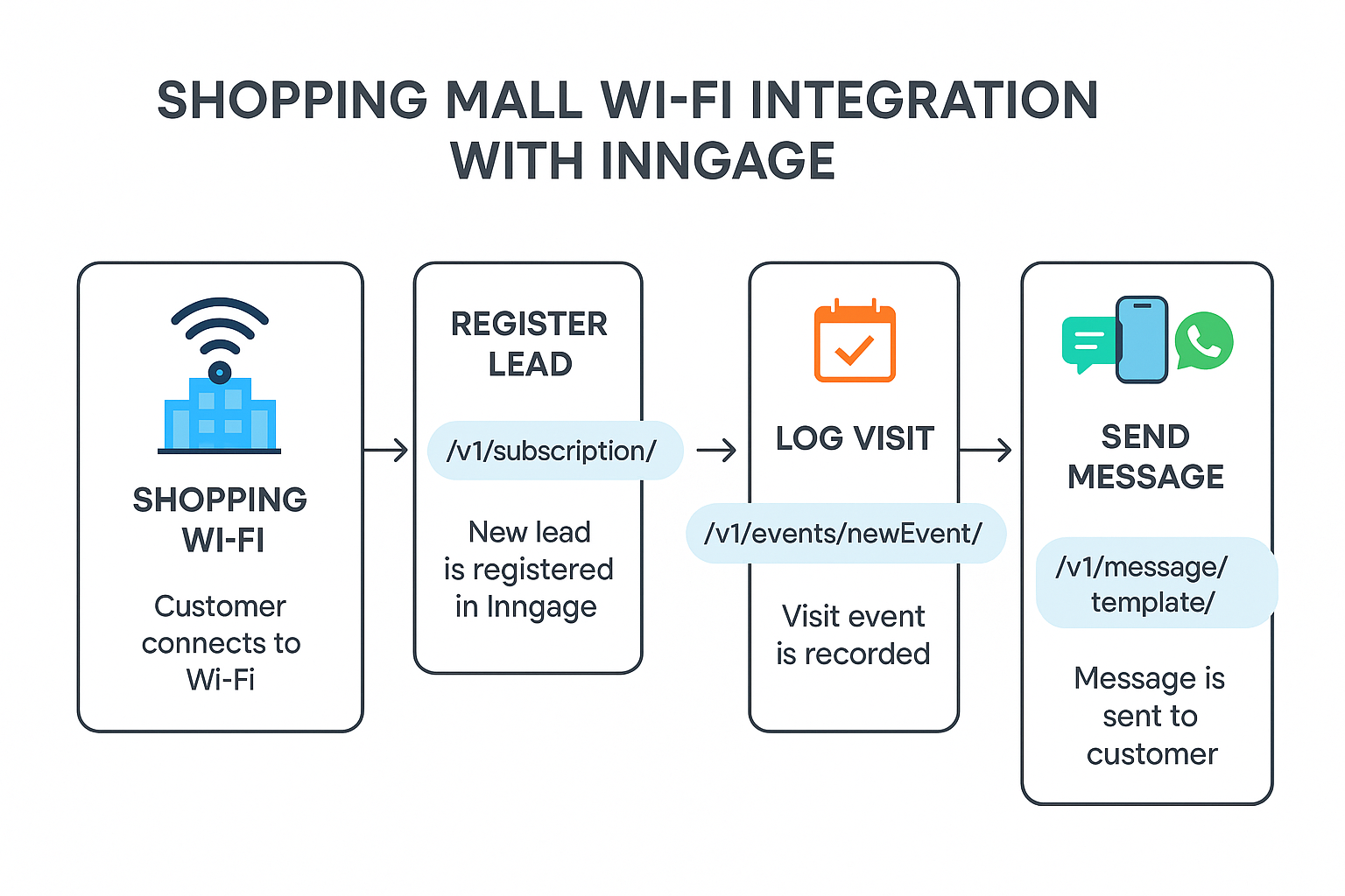 A integração do Wi-Fi com a Inngage permite que Shoppings registrem automaticamente novos visitantes e enviem mensagens personalizadas sempre que um cliente acessar a rede Wi-Fi.