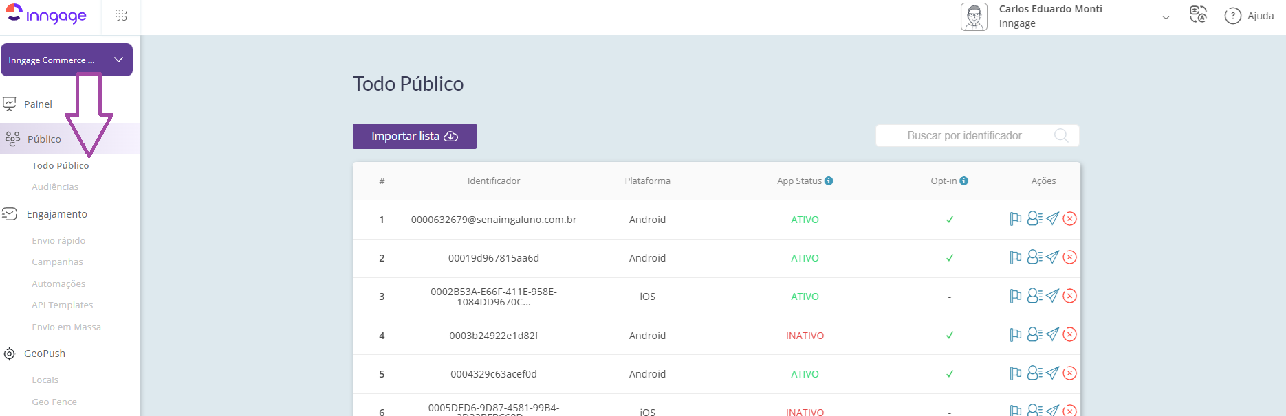 Nesta tela, você encontrará a listagem completa de todos os usuários registrados. A tabela exibe informações essenciais como Identificador, Plataforma, App Status, Opt-in e as opções de Ações disponíveis.