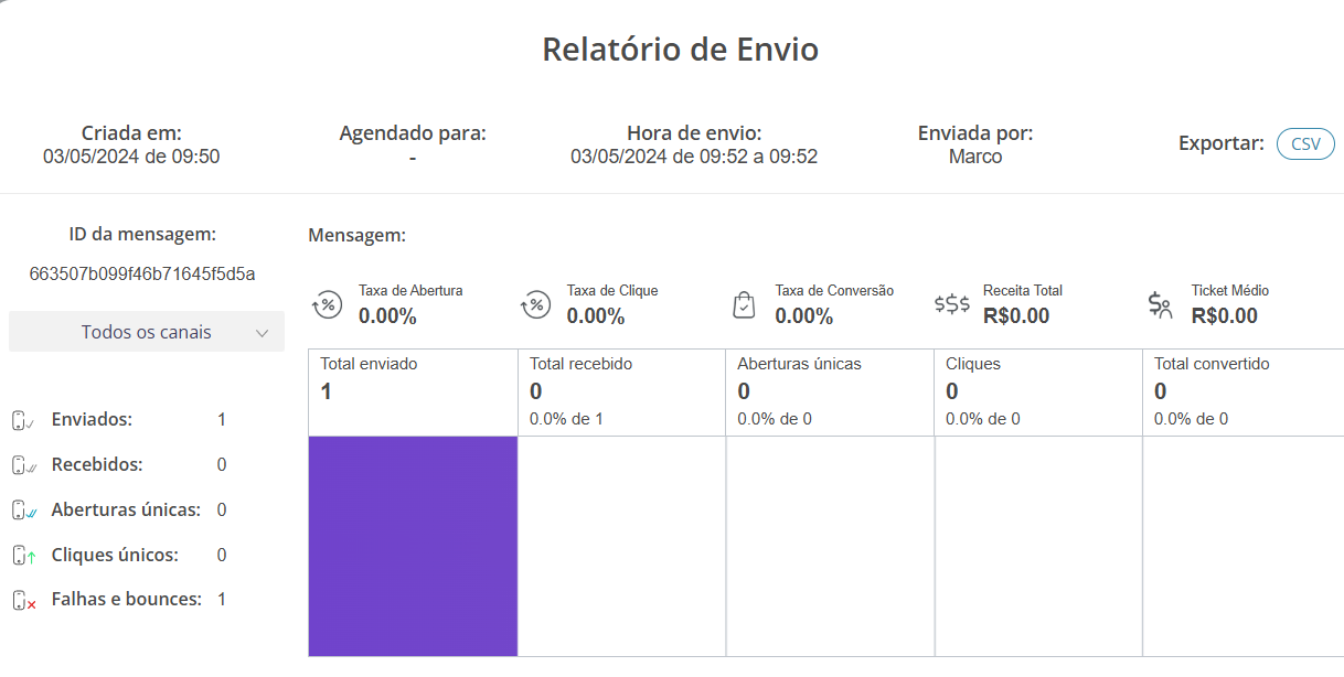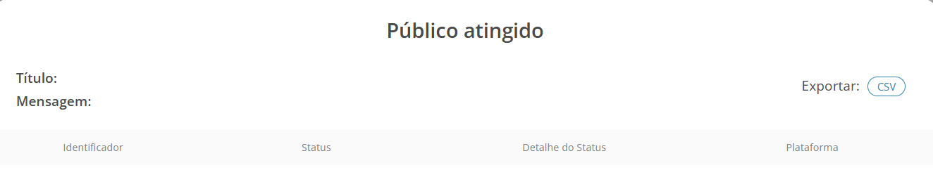 Nele você visualiza uma lista detalhada de cada destinatário que recebeu a notificação enviada, com seu respectivo status. Você também pode exportar a lista completa em CSV, clicando no botão na parte superior do pop up.