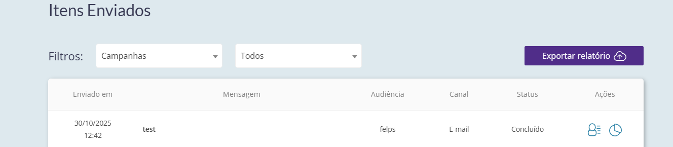 Pela lista você consegue visualizar as mensagens que foram enviadas com os respectivos data de envio (Enviado em), Mensagem, Audiência, Canal, Status (Podendo ser: Preparando envio, Falha, Nenhum destinatário encontrado, Concluído). Além disso, você tem um filtro onde pode segmentar suas buscas e ver somente as mensagens: Todos, Conluído, Preparando envio, Aguardando hora de envio, Enviando, Processando relatório, Falha, Aguardando aprovação, Recusado, Agendamento canelado, Falha ao longo do envio, Nenhum destinatário encontrado, Interrompido pelo usuário.