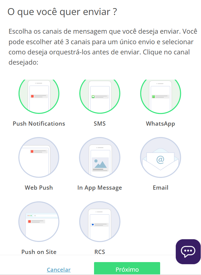 Nesse primeiro momento você vai definir o canal da mensagem, se enviará Push Notifications, SMS, WhatsApp ou Web Message. Além de definir todo o conteúdo da mensagem: