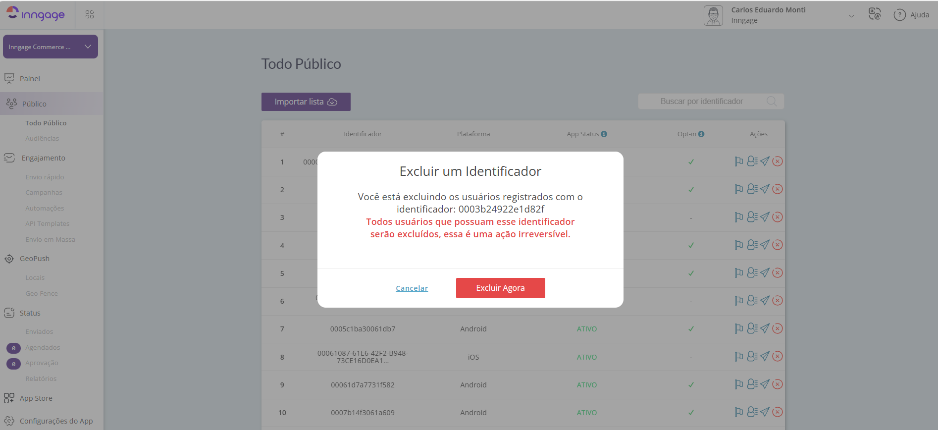 • Após confirmar, o identificador será removido da lista e os usuários relacionados a ele não receberão mais mensagens ou notificações via Inngage.