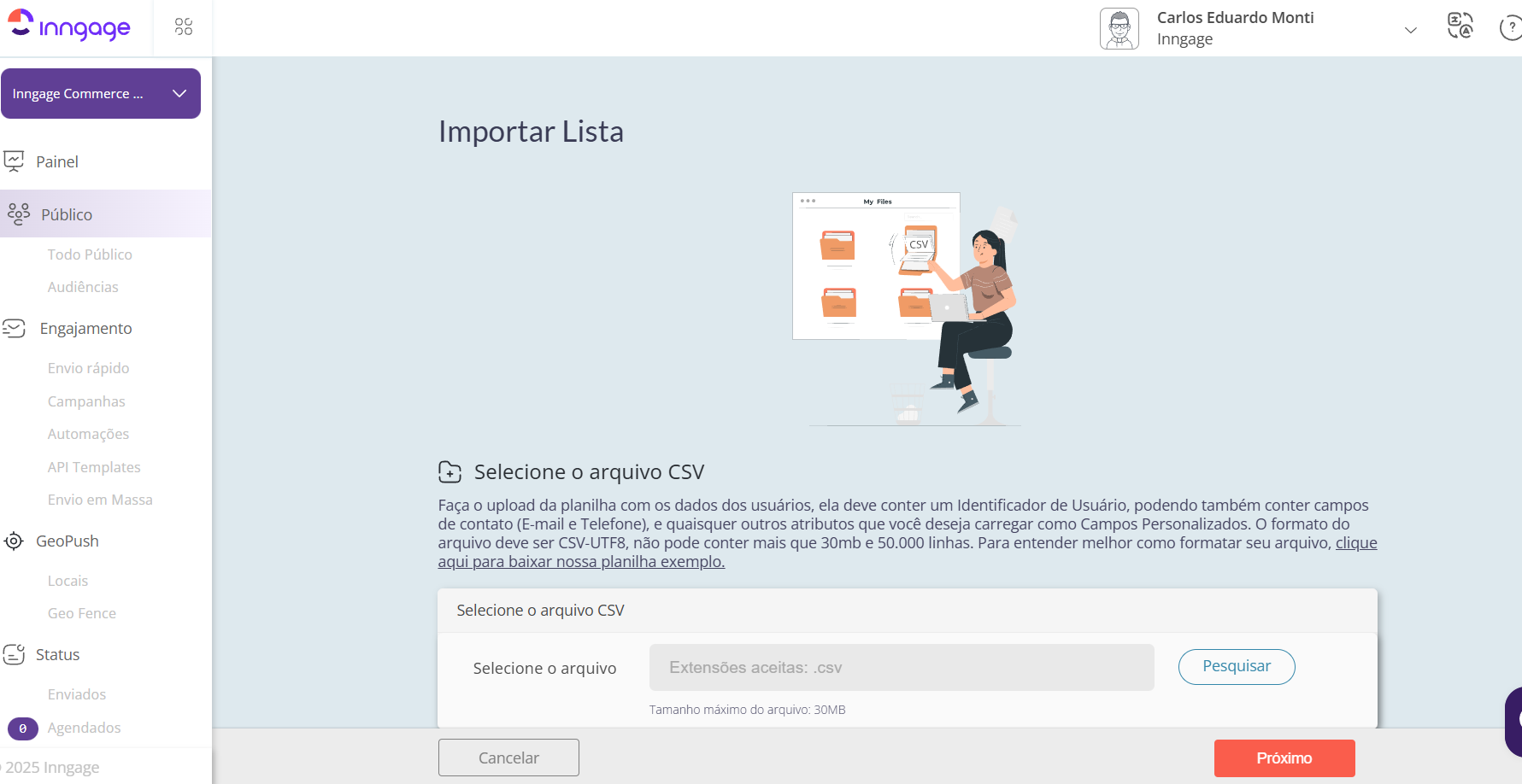 Acesse a tela "Todo o Público" e utilize a função "Importar Lista". Esta ação permite o envio de uma base de usuários e possibilita o cadastro de novos registros ou a atualização de dados de usuários já existentes na Inngage.