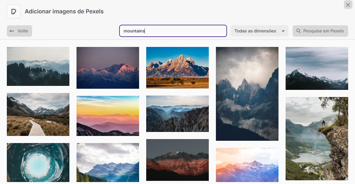 Se você não conseguiu encontrar uma imagem adequada no seu computador, recomendamos fortemente que você pesquise imagens no Pexels clicando no botão de imagem do Pexels.