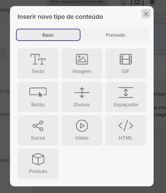 Uma janela modal contendo blocos de conteúdo básico aparecerá. Neste caso, clique no ícone Texto para preencher a estrutura com texto.