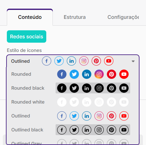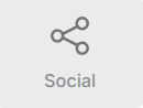 O bloco social vem predefinido com quatro ícones de mídia social padrão: Facebook, X, LinkedIn e Instagram.