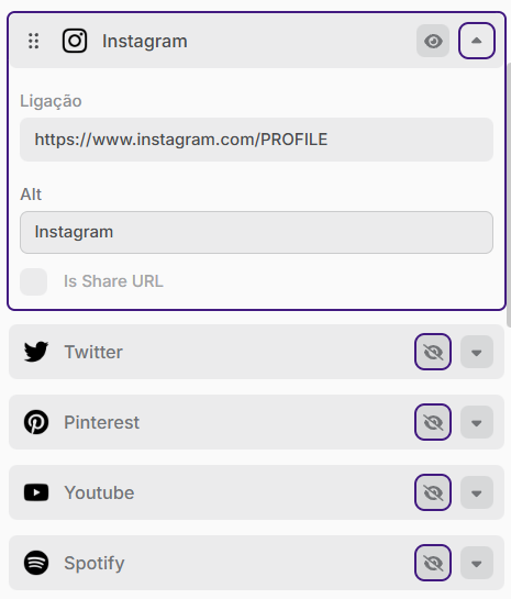 Você também pode reorganizar esses ícones ou ocultar alguns específicos. Se você tiver contas em outras plataformas, pode procurá-las em nossa lista ou adicionar suas próprias plataformas .