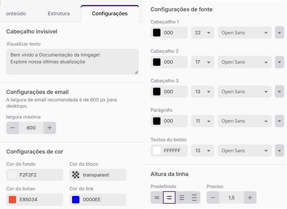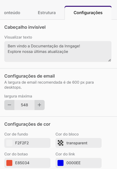 Na aba "Configurações" , você pode personalizar a cor de fundo do modelo, botões, estruturas e links .