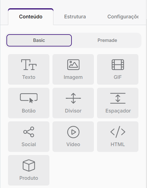 É possível inserir conteúdo como texto, imagens, botões, divisores, espaçadores, mídia social, vídeo, GIFs, conteúdo dinâmico e até mesmo código em estruturas.