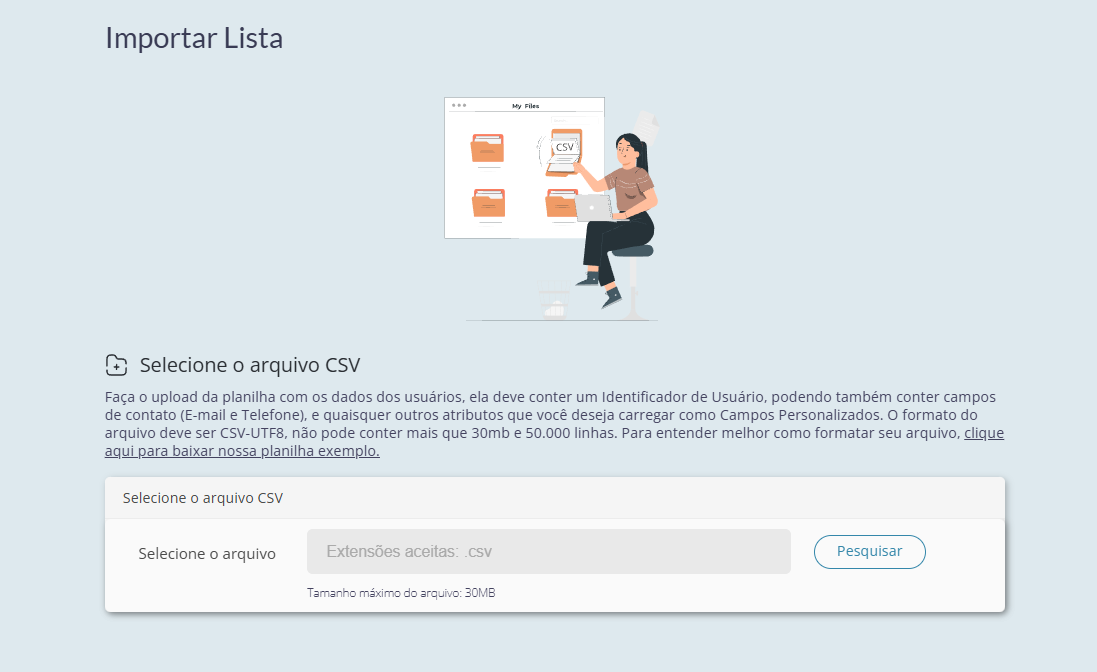 Ao selecionar a opção "Importar Lista" o usuário é direcionado a uma nova página, na qual possui a opção para selecionar o arquivo.csv