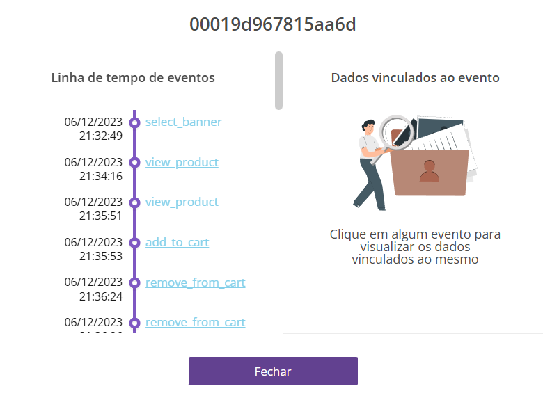 Ao clicar em qualquer evento específico na Linha do Tempo, você terá acesso imediato a todos os dados e atributos que foram vinculados a ele, permitindo uma análise precisa do contexto daquela ação do usuário.