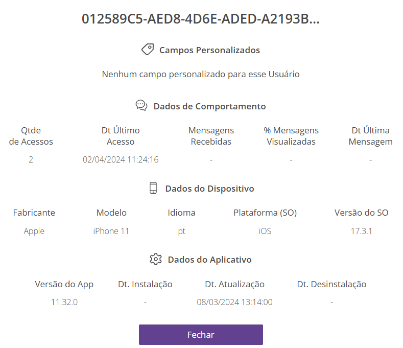 Dados de Comportamento: Informações que demonstram como o usuário utiliza e se engaja no aplicativo. Por exemplo: quantas vezes acessou, data do último acesso, quantas notificações ele recebeu, entre outras métricas de uso. -