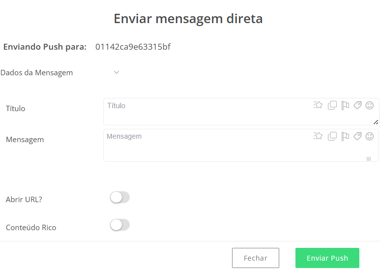 O terceiro ícone abre um pop-up para enviar uma notificação push somente para o usuário escolhido. É possível escolher o título, a mensagem, adicionar web links ou até conteúdo rico (png, jpeg, gif, mp3, mp4).