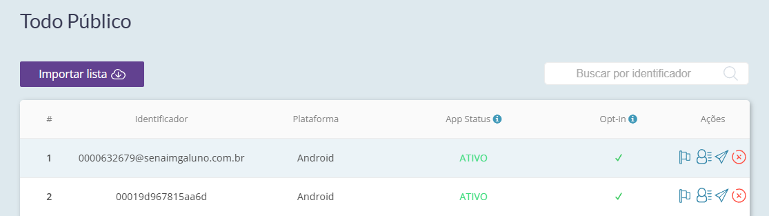 Ao acessar a página "Todo Público", você encontra uma lista detalhada de todos os usuários que já interagiram com o App pelo menos uma vez.