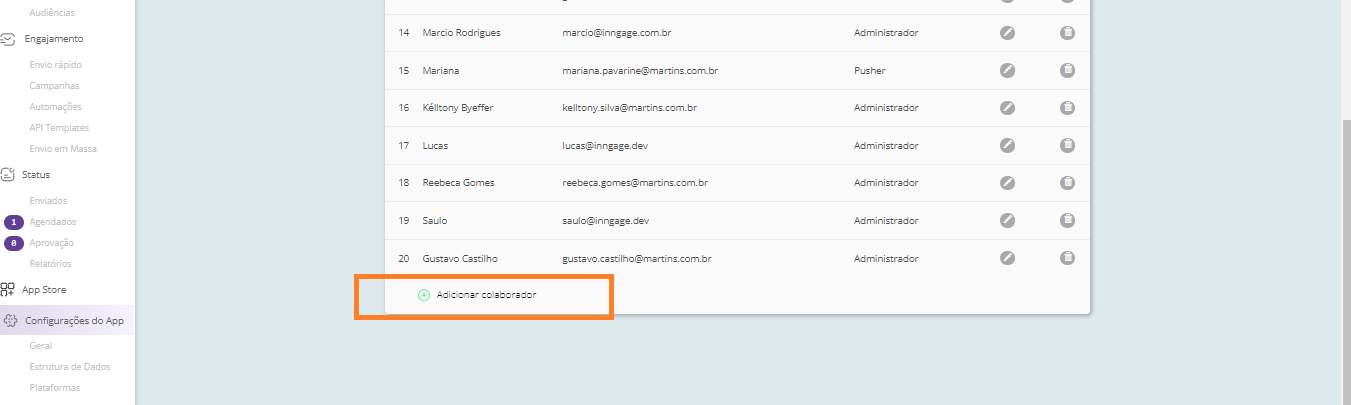 Com esses simples passos, você adicionará com facilidade novos colaboradores ao seu app Inngage, fortalecendo a sua equipe e garantindo um fluxo de trabalho colaborativo e eficiente.