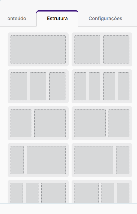 A imagem abaixo mostra todas as estruturas pré-definidas que você pode arrastar e soltar no modelo. Todas elas têm a mesma funcionalidade; a única diferença está no número e na distribuição espacial das colunas dentro delas.