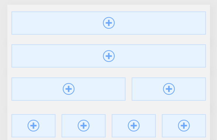 Aqui está um exemplo de um layout que acabamos de criar arrastando e soltando algumas dessas estruturas em nosso modelo. Este layout consiste em quatro estruturas (cada estrutura ocupa uma linha inteira), enquanto cada estrutura contém um número variável de colunas (para ser específico, a primeira estrutura tem uma coluna, a segunda tem uma, a terceira tem duas e a última estrutura tem quatro colunas).